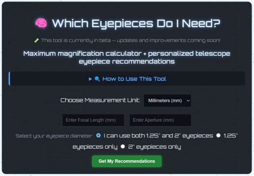 Our maximum magnification calculator and personalized telescope eyepiece recommendation tool will help you: